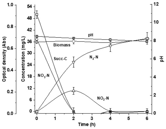 The static growth (Figure 2) can be attributed to the fact that a microorganism does not accumulate biomass when nurtured in an environment deficient in nitrogen [25]. Considering that nitrate was the sole nitrogen source available and was subsequently recovered entirely as molecular nitrogen, there was an inherent constraint on any potential for biomass growth. Without an available nitrogen source, an essential component for amino acid and nucleotide synthesis, Paracoccus would face significant challenges in augmenting its biomass.