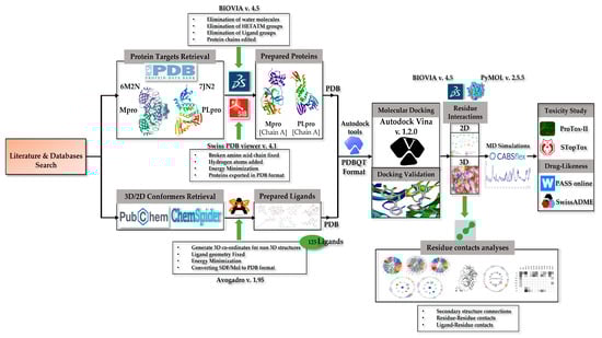 The protein structures of 3CLpro and PLpro were viewed and explored using BIOVIA Discovery Studio Visualizer 4.5 and PyMOL 2.5.5 [107,108]. Our knowledge of the number of HETATM groups and amino acid chains was obtained from these tools. As opposed to that, the ligands were visualized using Avogadro software v. 1.95 [109,110].