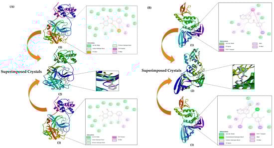 Docking validation: (A) (1) 3CLpro crystal with a re-docked inhibitor in the catalytic site, (2) superimposed 3CLpro crystals with re-docked and attached inhibitor, (3) original 3CLpro crystal with an attached inhibitor in the catalytic site (PDB ID: 6M2N). (B) (1) Original PLpro crystal (PDB ID: 7JN2) with an attached inhibitor in the active site, (2) superimposed PLpro crystals with re-docked and attached inhibitor, (3) PLpro crystal with a re-docked inhibitor in the active site. Re-docking experiments for the proteins 3CLpro and PLpro indicate the level of accuracy of the docking protocol used in the study.