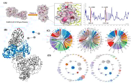 In the first case of bromosalinosporamide, carbon and oxygen atoms made direct non-covalent associations with HIS: 41 by forming seven atomic connections. On the other hand, indirect associations were made with CYS: 145, as the residue lay on the outer shell of the asteroid plot (see Figure 6A).