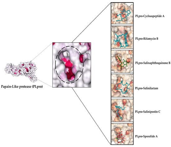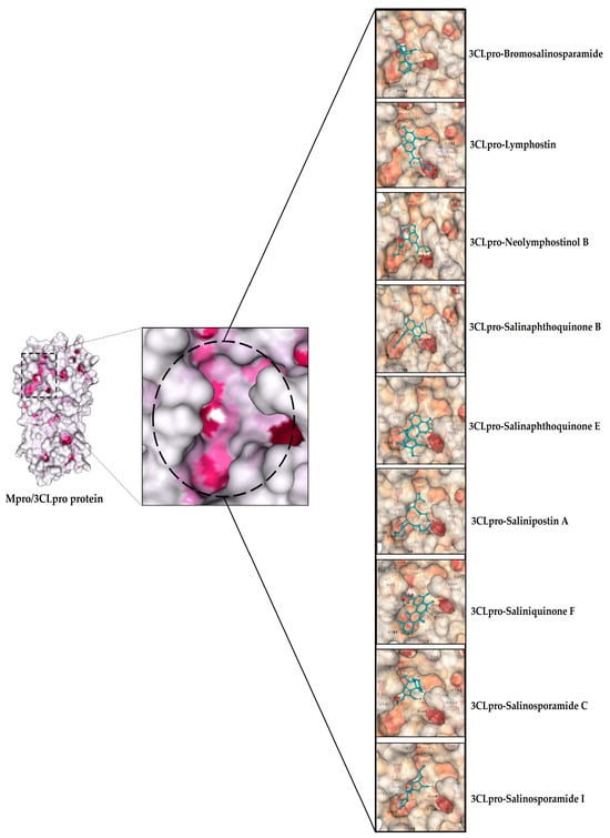 The goal of this study was to evaluate whether natural products from the genus Salinispora might be used as 3CLpro and PLpro inhibitors by conducting an in silico assessment (see Figure 1). Pre-screening against the 3CLpro and PLpro proteins using a built library made up of NPs from various marine sources revealed Salinispora metabolites that showed strong affinities and advantageous residue interactions. Additionally, the low molecular weight and established antimicrobial properties [33,34,35,36,37,38] of Salinispora metabolites were the main reasons for their selection to conduct this work. Small molecules in general are perceived as potentially effective protease inhibitors, especially in the instance of 3CLpro protein [39]. Out of 125 NPs, this study identified a select few NPs by placing more emphasis on the amino acid interactions rather than just the docking scores. This is because there is no assurance that high docking scores equate to therapeutic effectiveness [40,41].