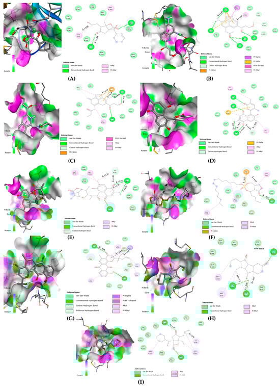 Two-dimensional amino acid interaction maps. (A) 3CLpro-bromosalinosporamide, (B) 3CLpro-lymphostin, (C) 3CLpro-neolymphostinol B, (D) 3CLpro-salinaphthoquinone B, (E) 3CLpro-salinaphthoquinone E, (F) 3CLpro-saliniposin A, (G) 3CLpro-saliniquinone F, (H) 3CLpro-salinosporamide C, (I) 3CLpro-salinosporamide I.