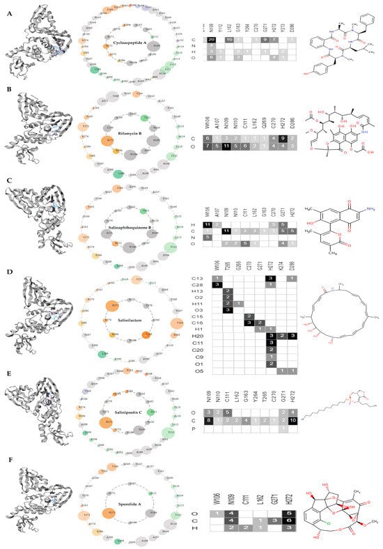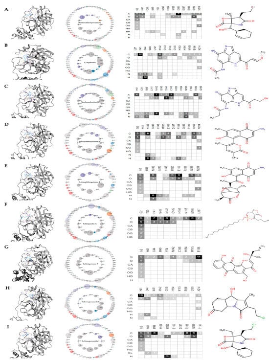 Asteroid plots and ligand residue matrices. (A) 3CLpro-bromosalinosporamide, (B) 3CLpro-lymphostin, (C) 3CLpro-neolymphostinol B, (D) 3CLpro-salinaphthoquinone B, (E) 3CLpro-salinaphthoquinone E, (F) 3CLpro-saliniposin A, (G) 3CLpro-saliniquinone F, (H) 3CLpro-salinosporamide C, (I) 3CLpro-salinosporamide I. The atomic scale interaction number percentage is represented by the circumference of the sphere. Residues are colored according to their respective secondary structures. The atoms of the ligands are displayed as rows in the ligand residue matrices, and the residues that are in contact with the ligand are displayed as columns. In the matrices, the number of atomic associations has also been presented. The shades of grey (from light to dark) depend on the number of atomic contacts made.