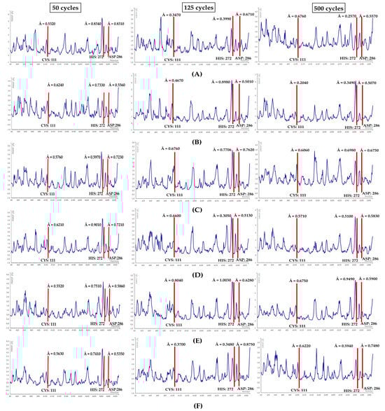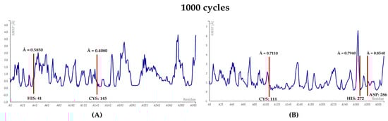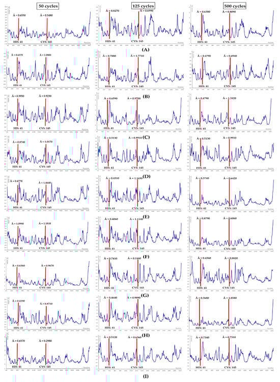 In the first case, the 3CLpro-bromosalinosporamide complex at 50 cycles showed fluctuations of HIS: 41 and CYS: 145 to be 0.65 Å and 0.54 Å, correspondingly. At 125 cycles, a rise in the fluctuation was witnessed for both residues. However, the RMSF value for HIS: 41 dropped and for CYS: 145 slightly increased at 500 cycles (see Figure 7A).