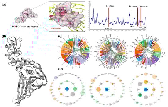 The tertiary structure, and consequently the function of the 3CLpro protein, are most likely determined by the orientation of interactions among the various secondary structural components. In Figure 3C, all non-covalent connections at the secondary structure levels are presented in the form of chord plots. Residue HIS: 41, which forms 52 atomic interactions with its immediate neighbors, is located in region S3_3 (colored red), presented as the outer edge of the chord plot. Amino acid CYS: 145, which is situated at the S11_11 region on the chord plot’s edge, is presented in a bright purple color. A total of 49 atomic connections are made by CYS: 145 with its immediate neighbors. These connections among the secondary structures are depicted as chords and each chord’s thickness depends on the total number of atomic connections among the residues. The plot depicting loops shows regions L5 and L13 that comprise HIS: 41 and CYS: 145 residues, correspondingly. The associations among the secondary structures indicate a strong correlation.