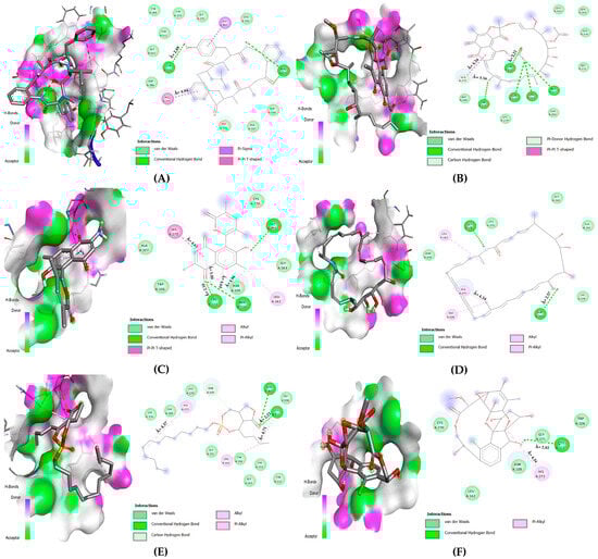 We made sure to convey the docking calculation results in this paper in an understandable manner. On the basis of the determined values for binding affinity, three main categories—low, moderate, and high—were used to group the data that are shown in Section 3.1.2 and Section 3.2.2. The moderate category was further split into lower-moderate and upper-moderate divisions. The resulting 250 protein–ligand complexes were explored for binding and non-binding residue analyses. BIOVIA Discovery Studio Visualizer 4.5 and PyMOL 2.5.5 assisted in revealing all the residues involved by providing us with the necessary 2D and 3D interaction maps.