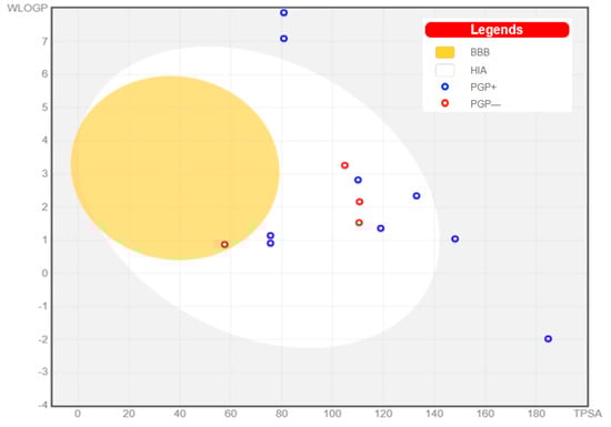 The ability of NPs to penetrate cells and the blood–brain barrier was also examined using the boiled egg diagram provided to us by the Swiss-ADME analysis. Additionally, having an average precision of approximately 95%, the PASSonline program allowed us to predict the bioactivity spectra for our chosen NPs based on their respective structural formulae. On this platform, the predictions are made on the basis of the information stored for over 300,000 organic compounds [123].