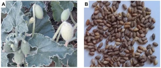 E. elaterium, a perennial plant, has a sprawling stem, cordate to triangular leaves that are quite fleshy, and flowers with yellowish petals. The fruit is green, has white hairs, and is oval in shape. As the fruit matures, it turns from green to yellowish-green, violently expelling its seeds and juice (Figure 1A). The seeds are 4–5 mm in size and are brown and egg-shaped (Figure 1B).