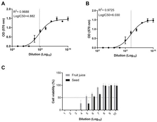 The MTT analysis, which is based on the measurement of mitochondrial metabolic activity, was performed to determine cell viability in cultures exposed to the fruit juice and seed extracts. For this purpose, the culture medium was removed from the plates, and the cells were washed twice with 200 μL PBS. Then, 100 μL of MA-104 containing a 5 mg concentration of MTT (Thermo Fisher, M6494; Waltham, MA, USA) was added to each well and incubated for an additional 4 h at 37 °C. At the end of this period, the amount of formazan crystals formed was determined by removing the medium and incubating it with DMSO (SERVA, 67-68-5; Heidelberg, Germany) for 30 min more. The absorbance at the 570 nm wavelength was measured using a microplate reader, and the inhibitor concentration 50 (IC50) of the test compounds was determined.