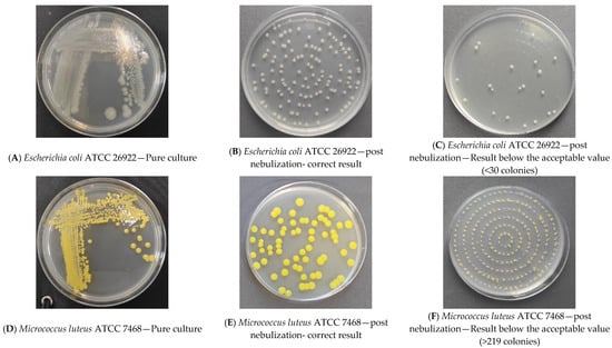 The analysis of the results of the experiments with bacterial strains allowed for the development of a procedure demonstrating the survivability of each strain under test conditions. The following pictures show a reduction culture (Figure 2A,D,G), the purpose of which is to check the purity of the strain and describe its morphology; a plate after nebulization with normal results (Figure 2B,E,H) and a plate after nebulization with abnormal results (Figure 2C,F,I). The correct plates display individual bacterial colonies after air sampling from the bioaerosol using a microbiological probe. A proper reading indicates a countable number of colonies ranging from 20 to 219 (216 is based on the number of holes in the probe head and the probable number of colonies table (as cited)). Based on the results analysis, an acceptable number of colonies between 50 and 216 and an optimal range between 100 and 150 were adopted. The analysis of the abundance of bacterial strains in the saline fluid allowed us to determine the curve of the relationship between the number of colonies (cfu/mL) and the McFarland scale (Table 2). In subsequent studies, suspensions were prepared specifying the degree on the McFarland scale. Based on the survival results of the bacterial strains in saline, all strains were found to be stable in saline for up to 4 h. Based on the results of the survival of bacterial strains in the air, it was found that although all strains have a high survival rate in the fluid (reduction in abundance by no more than 20% in 2 h), the strain with the highest survival rate in the air is M. luteus TCC 7468. Strains E. coli ATCC 26922 and S. aureus ATCC6538P had a reduction in abundance after nebulization in the test room of more than 98%; M. luteus ATCC 7468 had a reduction of about 38% within 30 min (Table 3).