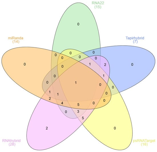 Five-set Venn diagram representing mutually common binding sites of mature sugarcane miRNAs predicted to potentially target the SCMV genome. The in silico prediction was established using computational tools (miRanda, RNA22, TAPIR, psRNATarget, and RNAhybrid) to identify potential targets of sugarcane-encoded miRNAs. The areas of overlap among computational tools show miRNA binding sites. The high-order intersection of five algorithms revealed the most potent mature sugarcane miRNA―ssp-miR1444c-3p.