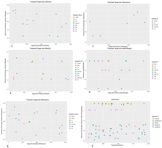 Individual sugarcane sof-miRNAs/ssp-miRNAs and their predicted high-confidence binding sites in the SCMV genome were predicted based on the ‘five algorithms’ approach. (A) miRNA sites were detected by miRanda. (B) Several miRNA target sites were detected by RNA22. (C) TAPIR identified sugarcane miRNA binding sites. (D) psRNATarget predicted several binding sites of sugarcane miRNAs. (E) The prediction of miRNA sites by RNAhybrid. (F) Union plot representing all predicted binding sites detected by all the algorithms used. Multiple copies of miRNA target binding sites are represented by colored dots. Targeted genes of SCMV are indicated by different colors.