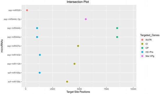 Intersection plot shows the consensus high-confidence binding sites of mature sugarcane miRNAs predicted by at least two computational tools. The colored dots represent sugarcane miRNA binding sites targeting different genes of SCMV.