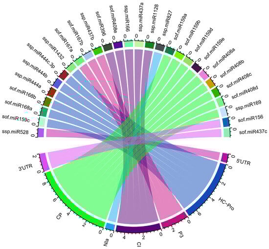 A Circos plot represents the predicted host–virus interactions of sugarcane miRNAs and SCMV target genes. A Circos plot was generated to visualize a comprehensive master miRNA regulatory network with novel antiviral targets (Figure 4). The generation of the miRNA–mRNA regulatory network was conducted using ‘Circos’ software [84].