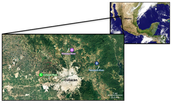 The river water and fecal samples (n = 94) were collected from October to December 2016 and June to August 2017 at different sampling sites in the agricultural Culiacan Valley in the Northwest of Mexico. The three sampling sites, Agua Caliente de los Monzon (site A), Jotagua (site B), and San Pedro de Rosales (site C), were selected to be 17–33 km apart and to represent the study area in the Culiacan Valley (Figure 1). Sites A and B were located in the mountain hillsides with a semi-humid climate. Site C was in close proximity to the urban areas of Navolato and Culiacan municipalities and had a semiarid climate.