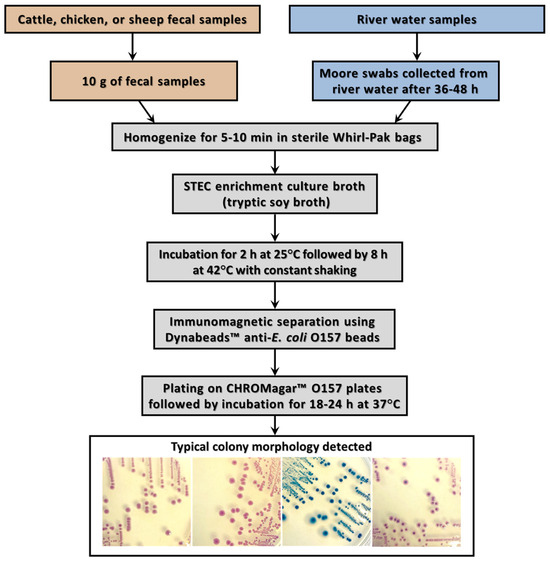 As shown in Figure 1, animal fecal and river water samples were recovered from three sampling sites in small communities at Agua Caliente de los Monzón (site A), Jotagua (site B), and San Pedro de Rosales (site C) along the Humaya River, Tamazula River, and Culiacan River, respectively, in the agricultural Culiacan Valley. The recovery and isolation of presumptive STEC colonies were performed by subjecting the environmental samples to an enrichment step (Figure 2). After an overnight incubation, enrichment broths were subjected to immunomagnetic separation with beads conjugated to anti-O157 antibody [46,50], followed by subsequent plating on selective chromogenic agar (Figure 2), a method developed to enable the recovery of a diverse STEC population with distinctive colonies from environmental samples.