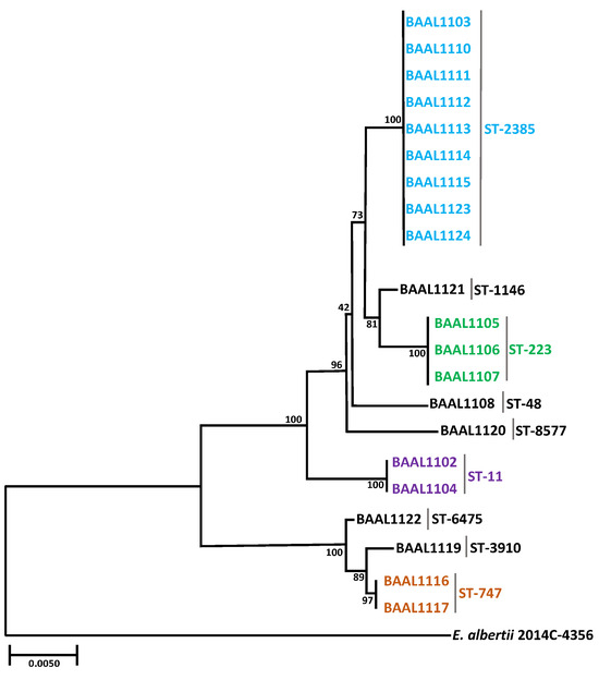 Interestingly, ST-233 was the next most common ST detected among the recovered STEC O113:H21 isolates and was found to be significantly correlated with chicken isolates from the Jotagua sampling site (Fisher’s exact test, p-value = 0.0006). Moreover, ST-747 was only detected in cattle O17:H45 isolates from the Agua Caliente sampling site and was previously identified in STEC isolates recovered from various leafy greens in the U.S. including spinach, spring mix, and kale [58]. ST-11 was only identified in O157:H7 STEC isolates BAAL1002 and BAAL1004 recovered from river water in the Jotagua sampling site. Previous reports documented ST-11 as a very common ST with over 14,000 entries in public databases, including over 1700 O157:H7 strains [58]. In the present study, ST-11 was only identified in stx2c-positive isolates belonging to serotype O157:H7; however, a significant correlation between ST and virulence profile was not identified among the isolates recovered. Further analysis of branch lengths on the phylogenetic tree indicated isolates with ST-747, ST-6475, and ST-3910 were genetically similar with less than a 0.5% nucleotide difference between them. By contrast, ST-747, ST-6475, and ST-3910, identified in the isolates recovered from Agua Caliente and San Pedro sampling locations, had an almost 2.0% difference to other STs, identified in the isolates recovered from Jotagua (Figure 3).