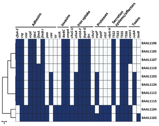 This study also identified effectors associated with the adherence, invasion and colonization of the target host cell, iron uptake, and effector protein secretion. Among the identified virulence determinants, Csg, the curli fimbriae, and the outer membrane protein A, OmpA, have been well characterized in STEC. In particular, curli has been well characterized in pathogenic E. coli and Salmonella enterica and has a role in biofilm formation as well as attachment to the extracellular matrix to enable the successful colonization of the mammalian host cells [102,103]. Recent studies in enterohemorrhagic E. coli have demonstrated OmpA to play an important role in the regulation of multiple pathogenic phenotypes, including attachment on distinct surfaces, biofilm formation, motility, and colonization and invasion of mammalian host cells [104]. Moreover, the presence of the siderophore enterobactin and ferric transport genes highlighted that the examined STEC isolates harbored the determinants for acquisition of iron, an essential nutrient for bacteria growth and increased virulence potential in enteric pathogens [105].