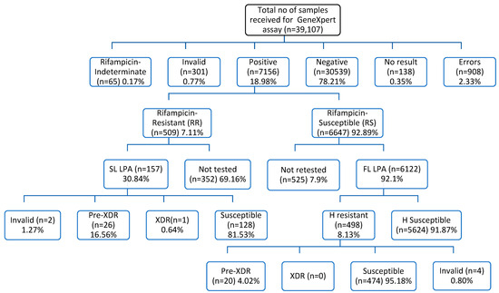 Samples Flow chart for screening and diagnosis of tuberculosis and drug-resistant tuberculosis cases. SL LPA—Second-Line drug LineProbe Assay; FL LPA—First-Line drug LineProbe Assay; Pre-XDR—Pre-Extremely Drug Resistant; XDR—Extremely Drug Resistant; H—Isoniazid.