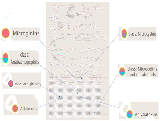 The molecular network of cyanotoxins extracted from fishpond water samples.