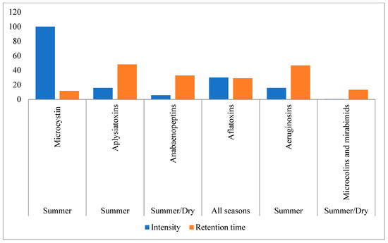 Principal component analysis of aeruginosins, anabaenopeptins, aflatoxin, aplysiatoxins, microcystin, microcolins, and marabmids based on peak intensity and retention time between different sampling seasons showed variations between each cyanometabolite. The maximum intensity observed is 100% from microcystin, and the minimum is 0.06 from microcolins and mirabimids. Aflatoxins displayed a higher retention time of 49.86 min, while the retention time of microcolins and mirabimids was 11.60 min. The graph displayed in Figure 4 indicates that microcystin microcolins and mirabimids varied the most in intensity in the summer season, while aflatoxins varied the most in the dry season. The greatest similarities in terms of retention and intensity were observed in anabaenopeptins, aplysiatoxins, and aeruginosins. Aflatoxins were observed throughout the seasons, with slight variations in intensity and retention time. Retention time accounted for 28.65% of the variation among cyanotoxins in South Africa. The variation in the peak intensity and retention of each cyanotoxin was significantly influenced by environmental factors at each sampling site.