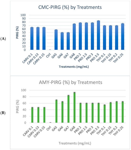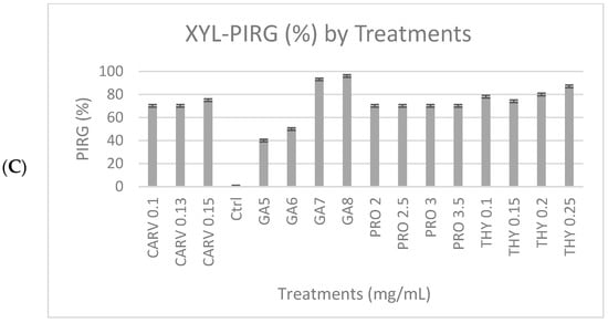 Figure 2. Percentage inhibition of radial growth (PIRG %) of G. boninense PER71 treated with different concentrations of phenolic compounds on enzyme production. The graph shows the percentage of enzyme production for (A) cellulase, (B) amylase, (C) xylanase, and the interpretation of data is based on 100% enzyme production. Vertical bars indicate standard error, and each value represents the mean of four replicates.