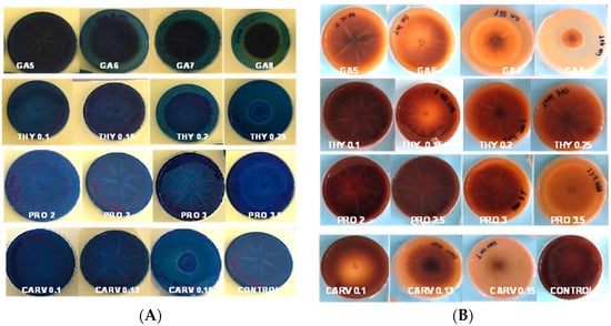 Figure 3. Poison Food test of G. boninense PER71 in the presence of different concentrations of phenolic acids and degradation of (A) RBBR dye and (B) tannic acid. GA—Gallic acid; THY—Thymol; PRO—Propolis; CARV—Carvacrol.