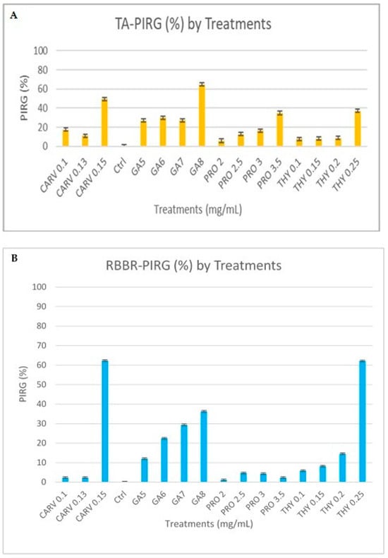 Figure 4. Percentage inhibition of radial growth (PIRG %) of G. boninense PER71 treated with different concentrations of phenolic compounds on enzyme production. The graph shows the percentage of enzyme production of (A) tannic Acid and (B) RBBR. The interpretation of data is based on 100% of enzyme production. Vertical bars indicate standard error, and each value represents the mean of four replicates.