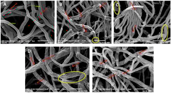 The mycelium cultivated without the presence of phenolic acids displayed a smooth, dense, and healthy appearance, featuring a diameter of 1.244 mm and clearly visible clamp connections (see Figure 5A). In contrast, the mycelium subjected to gibberellic acid (GA) exhibited reduced density and a shrivelled and fused appearance with a diameter of 2.732 mm, and the hyphae’s wrinkled surface displayed perforations (refer to Figure 5B). Thymol-treated mycelium showed signs of distortion (diameter of 2.005 mm), fused openings revealing empty hyphae, shrinkage (1.528 mm diameter), and detachment of the mycelium (see Figure 5D). Conversely, treatment with carvacrol (CARV) did not induce significant alterations in the mycelial structure, resulting only in shrivelled mycelium with a diameter of 0.709 mm (see Figure 5E).