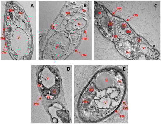 As stated in the previous section, mycelial sample surfaces were peeled off and subjected to a 6% glutaraldehyde solution for 24 h at room temperature. The samples were dehydrated in an HPLC graded ethanol series for five minutes, CO2-dried (SAMDRI 780-B Tousimis, Rockville, MD, USA), and then sputter-coated with gold–palladium in a Nanotech sputter coater after three rinses with 0.02 M of phosphate buffers (BAL-TEC SDC 050, New York, NY, USA). The coated mycelial samples were kept in a desiccator until they were inspected. The samples were embedded in resin (EMS, cat. 14380) and allowed to polymerise, and the samples were maintained. Ultrathin pieces (60 nm thick) were cut using a diamond knife (Ultracut R, Leica, Washington, DC, USA) and collected on Formvar-coated copper grids (EMS cat. FCF200). After contrast in uranyl acetate and lead citrate, they were cleaned and examined using a JEM-2100F field-emission electron microscope [8,17].