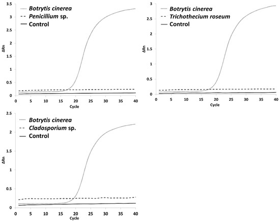 The study of fungi that may occur as secondary infections on grapes after a Botrytis cinerea infection is crucial for obtaining accurate biomass quantification results. There are many different fungal species potentially growing on Vitis vinifera, which could alter the quantification results [35]. This is particularly important when analysing different strains with varying growth characteristics. The Bc10nt primer used for qPCR was validated for cross-contamination with the three fungi Penicillium expansum, Trichothecium roseum and Cladosporium sp. After modifying the Bc10 primer set by adding an additional 10 bp following the genome sequence, no cross-contamination was detected. This demonstrates that the primer can successfully quantify B. cinerea biomass in field samples. However, it should be noted that grapevines can also be affected by other pathogens, such as Aspergillus niger. Analysing these organisms often requires a higher biosafety laboratory standard. Due to the extended primer pair, the likelihood of cross-contamination should be low. For example, studies in bunch trash showed no amplification of Aspergillus in qPCR [36] while using the primers of Suarez et al. [32].