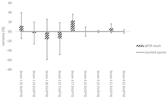 To investigate the potential impact of different B. cinerea strains on qPCR efficiency, we prepared and counted spore suspensions under a light microscope to obtain both high and low concentrations of spores per millilitre. The strains used were: strain 1 (Ruppertsberg, Germany, 2008), strain 2 (Göcklingen, Germany, 2021), strain 3 (Italy, 2011), strain 4 (Wachenheim, Germany, 2021), strain 5 (Geinsheim, Germany, 2021), strain 6 (Laumersheim, Germany, 2021). The spore suspensions were extracted and quantified against a standard curve using the same B. cinerea strains for every measurement, specifically strain 7 from Deidesheim, Germany, 2009. The primer efficiency ranged from 94% to 96%. The results were then compared with the counted cell number as shown in Figure 2. Most of the Botrytis strains used for the standard calibration curve were within a reasonable variance range compared to the manual counting, considering the limitations of obtaining exact results using the counting chamber. However, strain 3 showed a greater variance of up to 23.5%.