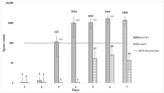 In the experiment, early signs of infection were observed on days 3 and 4, although no sporulation was visible on the berry. The detected biomass increased during the infection period and sporulation became visible after seven days (see Figure 3). Paired t-tests were performed for every individual between the spore and control variant (*** = p < 0.0001). The detection limit of the qPCR was 100 spores.