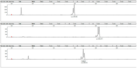 Sample picture of the capillary sequencer result. Labelled peaks in the diagram represent primer pair products in their respective basepair size. The tested strains were manually analysed after the experiment to ensure correct measurements of the software.