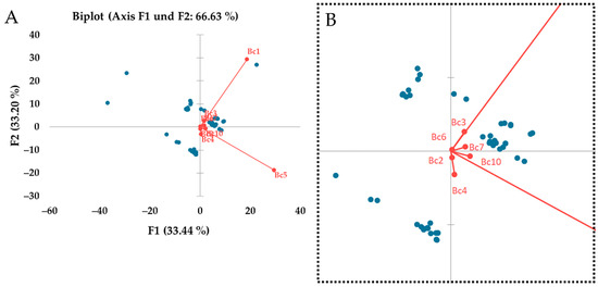 The tested primer pairs vary on how they affect the differentiation of the strains. Principal component analysis (PCA) was conducted and shows that some of the primers have a greater variety regarding the band sizes detected by SSR-PCR (Figure 6). For example, Bc1 and Bc5 contribute greatly to strain differentiation while Bc6 and Bc9 do not contribute much to strain differentiation.