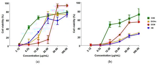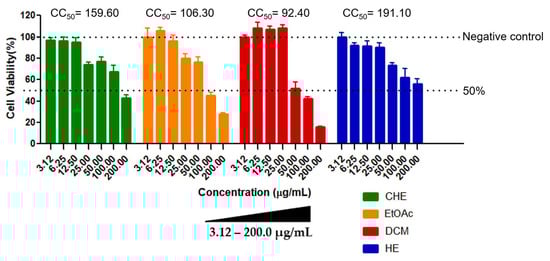 Cell viability could be determined for all samples. In general, the results showed a dose-dependent response on treated cells, where higher concentrations of the CHE and fractions resulted in high cytotoxicity compared to the untreated controls (Figure 1). The HE fraction showed the lowest cytotoxicity, with CC50 = 191.10 ± 4.15 µg/mL, while the DCM fraction was the most cytotoxic (CC50 = 92.40 ± 3.12 µg/mL). No cytotoxic effect was observed in control cells, i.e., cells treated with 0.5% DMSO (v/v), indicating that the vehicle used in the assays did not interfere with cell viability, as expected.