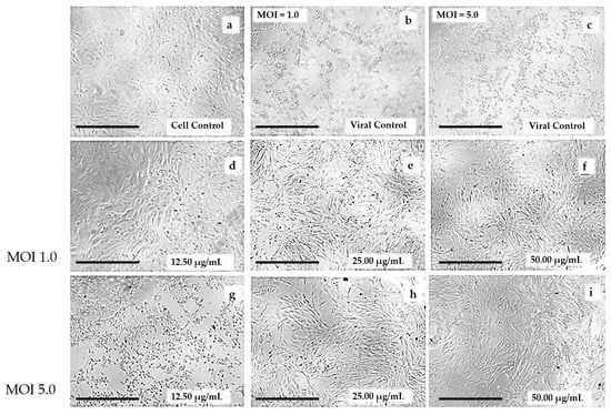 Crude hydroethanolic extract (CHE) of Bauhinia holophylla leaves reduced cytopathic effect in Vero cells induced by ZIKV infection. (a) Control cells (non-infected Vero cells, only with the addition of DMSO at 0.5% v/v); (b,c) viral controls (Vero cells infected with ZIKV at MOI 1.0 and 5, 0 respectively, only with the addition of DMSO at 0.5% v/v, respectively); (d–f) Vero cells infected with ZIKV at MOI = 1.0 and treated with CHE at 12.50; 25.00 and 50.00 µg/mL, respectively, after 48 h of incubation at 37 °C; (g–i) Vero cells infected with ZIKV at MOI = 5.0 and treated with CHE at 12.50; 25.00 and 50.00 µg/mL, respectively, after 48 h of incubation at 37 °C. Scale bar = 400 µm.