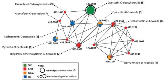 In the molecular network formed by the FBMN workflow, some classes of O-glycosylated flavonoids were annotated and considered promising candidates for antiviral activity, particularly, quercetin-O-deoxyhexoside (Figure 4), found in CHE.