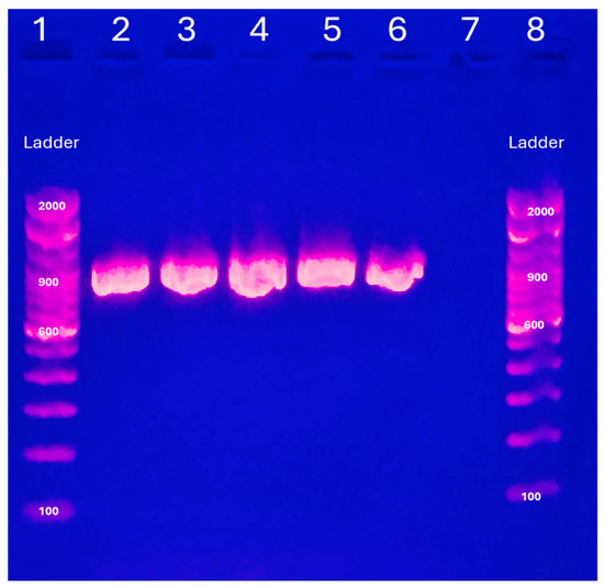 PCR amplicons of the hexon gene of the fowl adenovirus from liver samples in agarose gel. Lane 1: 100 bp DNA Ladder. Lanes 2–5: Fowl Adenovirus DNA. Lane 6: Positive control. Lane 7: Amplification of negative control. Lane 8: 100 bp DNA Ladder.