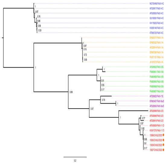 The amplified PCR products from the liver samples were purified using a PureLink™ Quick Gel Extraction Kit (Invitrogen, USA) according to the manufacturer’s instructions. Austral Omics (Valdivia, Los Ríos Region, Chile) provided sequencing services. Raw nucleotide sequences of the FAdV hexon genes were edited, aligned, and used for phylogenetic analysis. The sequences from each sample were assembled using Bioedit v7.2.5. Twenty-seven hexon gene sequences belonging to the main FAdV serotypes were retrieved from GenBank and included in the analysis, along with the four sequences from this case. The datasets were aligned using MAFFT v.7 online software (http://mafft.cbrc.jp/alignment/server/large.html) (accessed on 3 April 2024). A maximum-likelihood tree was created using PhyML 3.0, and a bootstrap expectation (TBE) process with 1000 replicates supported the robustness of the nodes. The tree was visualized and edited in the FigTree v. 7.4.4 software. The divergence of the Chilean field isolates in relation to the five FAdV species was estimated using MEGA X. analyses with the maximum composite likelihood model.