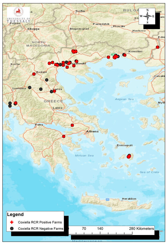 - Pape, M.; Bouzalas, E.G.; Koptopoulos, G.S.; Mandraveli, K.; Arvanitidou-Vagiona, M.; Nikolaidis, P.; Alexiou-Daniel, S. The Serological Prevalence of Coxiella burnetii Antibodies in Sheep and Goats in Northern Greece. Clin. Microbiol. Infect. 2009, 15, 146–147. [Google Scholar] [CrossRef] [PubMed]