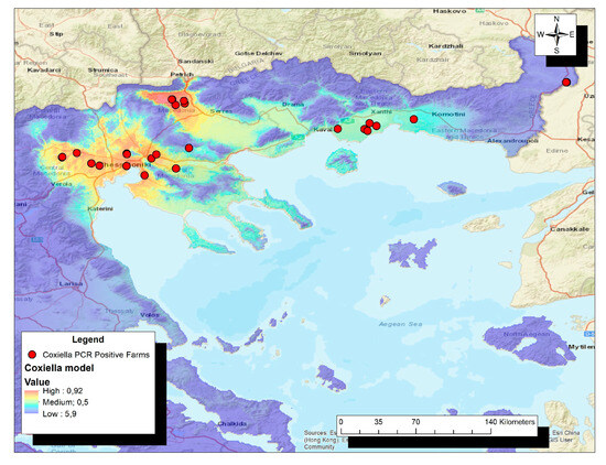 The present work can be considered the first step towards a more accurate approximation of the distribution of this pathogen of significant importance in the country and towards the identification of all environmental variables that affect it. Our study provides information that might be essential when designing eradication strategies for C. burnetii in countries with variable geographical landscapes, such as Greece.