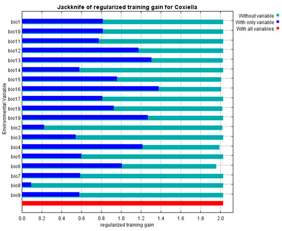 The contribution of each environmental variable to the MaxEnt model analyzed in this study is presented in Table 2. Jackknife test results of variable importance for cattle exposure to C. burnetii in the areas of Macedonia and Thrace are shown in Figure 3.