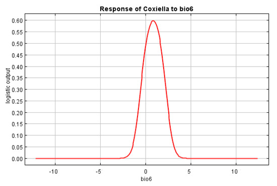 The environmental variable that decreased the gain the most when it was omitted was bio6 (minimal temperature of the coldest month), which therefore appeared to have the most information that was not present in the other variables, with a minimum temperature of the coldest month above 0 °C being associated with the presence of the bacterium (Figure 5).