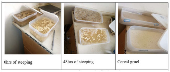 The maize and pearl millet steeped for forty-eight (48) hours were aseptically wet milled separately using a blender as shown in Figure 1 and kneaded into dough for twenty-four (24) hours, after which a 10% slurry was prepared for tenfold serial dilution. Lactic acid bacteria enumeration was carried out on each cereal slurry by employing the pour plate method using deMan, Rogosa, Sharpe medium (MRS, Oxoid CM361) agar with the pH adjusted to 6.2 using HCl, and 0.1% cycloheximide was included to inhibit the growth of yeast. The inoculated plates were then anaerobically incubated in an anaerobic jar for 48 h at 30 °C using CampyGenTM 2.5 L (Mitsubishi Gas Chemical Company Inc., Tokyo, Japan) to create an anaerobic medium for the period of the incubation [11]. On the appropriate MRS agar plate, colonies of lactic acid bacteria were chosen from a segment of the highest dilution for each cereal, and they were then subcultured into MRS broth (Oxoid CM359; Oxoid Ltd., Basingstoke, Hampshire, UK) and purified on MRS agar (MRS, Oxoid CM361) by streaking repeatedly.