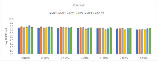 In the case of bile salt, Boke et al. [30] indicated that LAB intended for probiotic use must be able to tolerate bile salt at a concentration level of 0.15–0.3%, a reference considered to be most appropriate for selecting probiotic bacteria. It is estimated that the average intestinal bile content is 0.3% w/v, and a 4 h stay is advised [25]. Even though bile tolerance is generally strain-dependent according to Adefisoye et al. [29], Gram-positive bacteria are more susceptible to bile salts, and it is not possible to identify a particular species of bacterium that is more resistant to bile salts than others since bile tolerance is strain-specific, according to Mishra and Prasad [31]. Variations in pH, temperature and other environmental settings can either increase or decrease a bacteria’s resistance to bile salts [32]. The tolerance of probiotics to high bile concentrations can also be improved by pre-exposing them to a low concentration of bile salts for a period of time [33].
