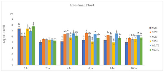 The percentage survivability of LAB isolates in the intestinal fluid was significantly affected for all periods except at 2 h. The percentage survival was significantly higher in MLT7, followed by MZ4 and MZ1, while MLT5, MZ2 and MZ3 recorded the least at 0 h. MZ3 did varied significant from MZ1 and MZ4 but was similar to MZ2, MLT5 and MLT7 at the 4th h. Additionally, MZ2 was significantly higher compared to MZ1, but both are similar to MZ3, MZ4, MLT5 and MLT7 at 6 h. Significant variation was observed at 8 h, where MLT5 was higher than LAB isolates MLT7, MZ4 and MZ1 but was similar to LAB isolates MZ2 and MZ3. At 10 h, MLT recorded the highest significant value compared to the other LAB isolates. MLT7, MZ2 and MZ3 were similar but significantly higher than MZ1 and MZ4 isolates, as shown in Table 5.