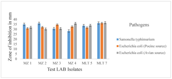 The antimicrobial activity of the chosen isolates was assessed against Salmonella thyphimurium, Escherichia coli (isolated from chicken) and Escherichia coli (isolated from pig), three indicator pathogens. The diameter zones of inhibition demonstrated that every isolate had antibacterial properties against the indicator pathogens, as shown in Figure 10.