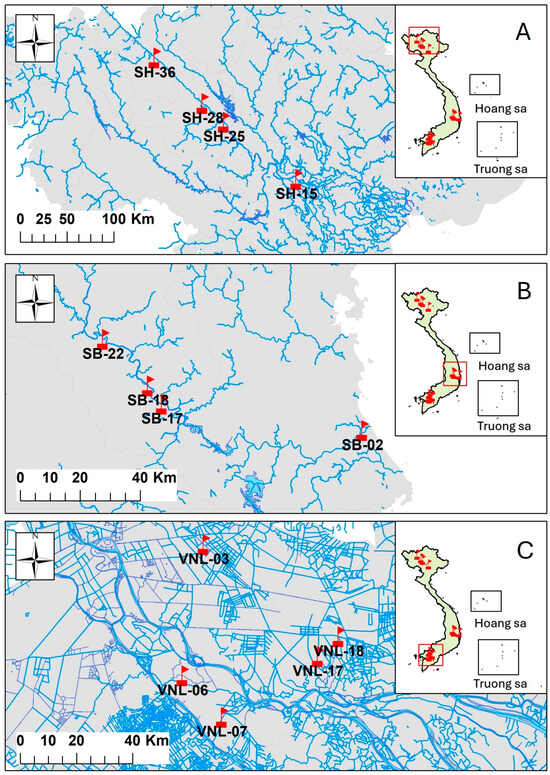 Sampling locations indicated in the map of Vietnam. Note: samples labeled with “SH” were from the Red river region in northern Vietnam (A), samples labeled with “SB” were from the Ba river region in central Vietnam (B), and those labeled with “VNL” were from Mekong delta flood zone in southern Vietnam (C). The inlets show the relative positions of the respective sampling sites on the map of Vietnam.
