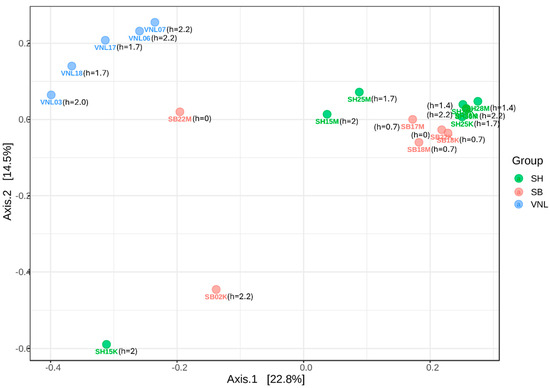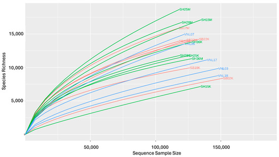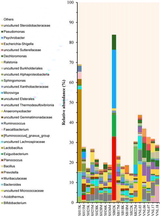To estimate the alpha diversity levels of the samples, the respective rarefaction curves were established (Figure 2). Interestingly, the samples having the highest diversity levels were those taken from the Red river in the rainy season, including SH25M, SH28M, and SH15M, while those having the lowest diversity levels were two river samples taken in the dry season (SH15K, SB02K) and two taken from the Mekong delta flood zone (VNL18, VNL03). Interestingly, SH15K had the highest Chao1 index (rich in species) while, surprisingly, it grouped with SB02K and VNL03 as the three samples having the lowest Shannon indices but the highest Simpson indices (Figure 3, Table S3). These results suggest that the bacterial communities in those three samples are significantly different from the rest. Indeed, this is apparent when comparing the taxonomic compositions of the bacterial communities (Figure 4), which show the distinct compositions of SH15K, SB02K, and VNL03, with typically some genera abundantly dominating these communities. The differences of the bacterial communities of these three samples from the rest were also demonstrated by the results of PCoA (Figure 5) and cluster analysis (Figure S2) based on Bray–Curtis distances.